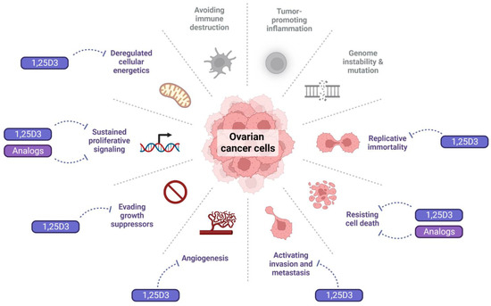 Impact of 1,25D3 and its analogs on the hallmarks of cancer in OC cells. In color, the hallmarks affected by 1,25D3 (see main text below), in gray, those where no relevant studies were found. The dotted blunt arrows indicate inhibition.