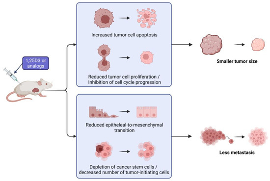 The anticancer activity of 1,25D3 and its analogs in OC models has already been studied broadly in vitro but there are only a few studies about their effects in vivo. Figure 4 summarizes the observed effects found in in vivo studies.
