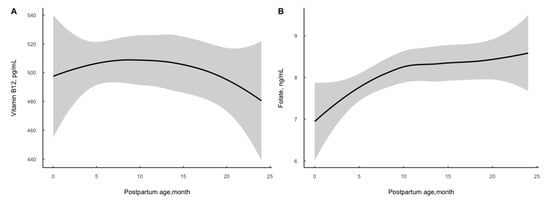 The present study showed a moderate prevalence of serum vitamin B12 and folate deficiency in women within 2 years postpartum. Vitamin B12 increased slightly early on postpartum and then dropped over time. Serum vitamin B12 and folate concentrations in postpartum women have been reported in several studies previously. In a cross-sectional study from the Netherlands, the prevalence of vitamin B12 deficiency (<180 pmol/L) was 9.09% [3]. In a study from Tanzania, the prevalence of vitamin B12 (<203 pg/mL) deficiency was 5.2%, insufficiency (203–271 pg/mL) was 25.6% and the median concentration was 395.4 (286.8–523.5) ng/mL among women three months postpartum [4]. A Brazilian cohort study revealed that the prevalence of vitamin B12-deficient status (<148 pmol/L) was 3.9% and the median level was 310 (249–391) pmol/L at 28–50 days postpartum; at 88–119 days postpartum, the rate of deficiency was 0 and the median level was 283 (217–374) pmol/L [28]. In China, a cross-sectional study including 1976 women within 2 years postpartum showed that the median serum vitamin B12 level was 469.0 (349.0–633.5) pg/mL, the prevalence of vitamin B12 deficiency (<200 pg/mL) was 2.7% and the marginal deficiency (200–300 pg/mL) rate was 12.8% [29]. In another study from Guizhou and Henan including 309 lactating women, the level of vitamin B12 was 437.7 (418.7–457.6) pg/mL and 2.3% of them suffered deficiency (<200 pg/mL) [6]. Our results showed that serum vitamin B12 increased slightly in the first few months after delivery, reached its peak at the 10–15th month and then dropped rapidly with postpartum age. The median level of vitamin B12 was 494.59 (373.21–650.20) pg/mL among women within 2 years postpartum, and the rates of deficiency and marginal deficiency were 3.26% and 9.27%, respectively. The biomarkers suggested serum vitamin B12 status of postpartum women in Zhejiang province was sufficient.