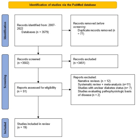 Our literature search identified 3579 articles, of which 77 duplicate records were removed. The remaining 3502 records were screened, and 51 of them matched the inclusion criteria. Then, these studies were assessed for eligibility, 12 narrative review papers, 11 systematic reviews and meta-analyses, 7 studies with unclear diabetic status and 2 studies evaluating pathophysiologic basis of disease were excluded. Thus, our study was based on 19 cohort studies (Figure 1).