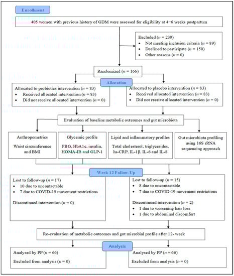Participant recruitment for this study was conducted between 1 March 2018 and 1 November 2020 due to the disruptions caused by the COVID-19 outbreak. The trial was completed on 15 April 2021. As shown in Figure 1, data related to 2350 women with a recent history of GDM were obtained from UKM Medical Center’s delivery records, and 405 post-GDM women were further assessed for eligibility. As only 166 of these post-GDM women were eligible and willing to participate in this trial, the sample was randomly segregated into the probiotics (n = 83) or the placebo (n = 83) group. The 12-week intervention was completed by 66 participants from each group, with 85–100% and 85–95% compliance rates in the probiotics and placebo groups, respectively. The majority (89.4%) of the probiotics group reported beneficial effects, such as a reduction in constipation and bloating, and 15% noted improvements in mood. Although 20% of the total sample (n = 34) was lost to follow-up mainly due to being uncontactable and to movement restrictions related to COVID-19, only 2 participants from the probiotics group discontinued supplementation due to side effects. None of the participants who completed the trial were on any medications or antibiotics, and none consumed foods or other supplements that were rich in prebiotics/probiotics/synbiotics during the 12-week intervention.