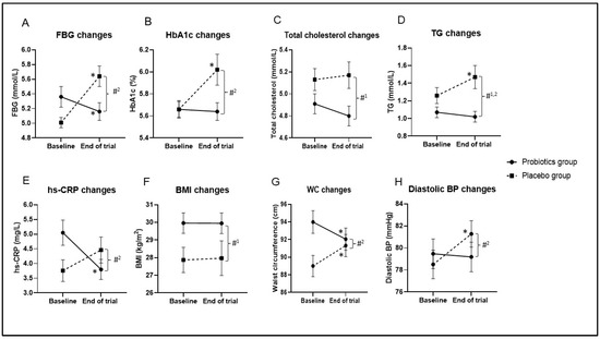 Changes in biochemical and anthropometric outcomes during 12-week intervention. Data are presented as mean ± standard error of the mean. (A) Fasting blood glucose (FBG) changes, (B) HbA1c changes, (C) total cholesterol changes, (D) triglyceride (TG) changes, (E) high-sensitivity C-reactive protein (hs-CRP) changes, (F) body mass index (BMI) changes, (G) waist circumference (WC) changes, (H) diastolic blood pressure (BP) changes. p-value < 0.05 was considered statistically significant. * Significant difference within the group. * p-value < 0.05 was considered statistically significant. #1 Significant difference between the two groups based on repeated-measures analysis of variance (ANOVA). #2 Significant interaction between the outcome and intervention group.