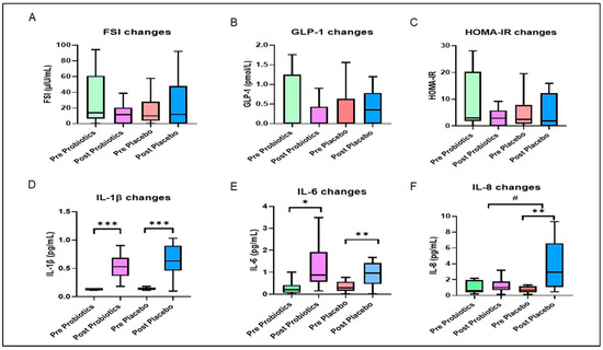 Changes in glycemic and inflammatory outcomes during the 12-week intervention. The box represents the interquartile range (IQR), the inside line represents the median, and the whisker represents the maximum and minimum value. (A) Fasting serum insulin (FSI) changes, (B) active glucagon-like peptide-1 (GLP-1) changes, (C) homeostasis model assessment of insulin resistance (HOMA-IR) changes, (D) interleukin-1β (IL-1 β changes), (E) interlukin-6 (IL-6) changes, (F) interleukin-8 (IL-8) changes. * Significant difference within the group. * p-value < 0.05, ** p-value < 0.01, and *** p-value < 0.001 were considered statistically significant. # Significant difference between the two groups. Changes in Inflammatory Outcomes.