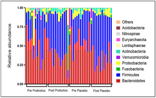 At the phylum level, the baseline relative abundance of gut microbial compositions in both groups was dominated by Bacteroidetes followed by Firmicutes, Proteobacteria, and Verrucomicrobia (Figure 4; Supplementary Table S5). The pattern of baseline gut microbial composition within the probiotics group showed slight inter-individual variation; specifically, Proteobacteria and Firmicutes were more enriched than Bacteroidetes in a small number of participants. In comparison, the pattern of baseline gut microbial composition was uniformly dominated by Bacteroidetes in the placebo group. After the 12-week intervention, the relative abundance of Bacteroidetes was depleted and Firmicutes was elevated (Figure 4) compared with the baseline. The ratio of Bacteroidetes to Firmicutes was significantly lower within the two groups at the end of the trial when compared with the baseline (p < 0.05).