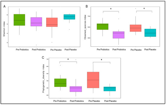 The Shannon diversity index reflects gut microbial evenness, and the index was stable during the trial in both groups (p > 0.05; Figure 5A). In terms of microbial richness, the observed species index indicated significant reductions in the gut microbial composition in the intervention group (MD = −15.83; 95% CI = −26.12, −5.55; p = 0.0031; Figure 5) and the placebo group (MD = −11.75; 95% CI = −22.04, −1.46; p =0.026; Figure 5) compared with the baseline. The gut microbial phylogenetic diversity was also significantly lower within the placebo group (MD = −13.42; 95% CI = −24.08, −2.75; p = 0.015; Figure 5C) and the probiotics group (MD = −11.08; 95% CI = −21.75, −0.42; p = 0.042; Figure 5C) compared with the baseline. Nonetheless, between the two groups, the Shannon diversity, observed species, and phylogenetic diversity indices were comparable (p > 0.05; Figure 5).