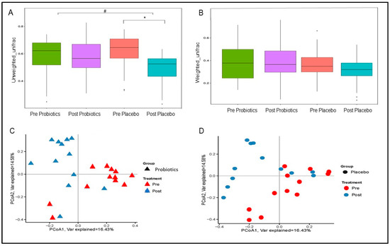 Changes in gut microbial β diversity within the two groups. (A) Boxplots of unweighted UniFrac distance. (B) Boxplots of weighted UniFrac distance. Principal coordinate analysis (PCoA) plots based on Bray–Curtis (BC) distance within the probiotics (C) and placebo (D) groups. p-value < 0.05 was considered statistically significant. * Significant difference within the group. # Significant difference between the two groups.
