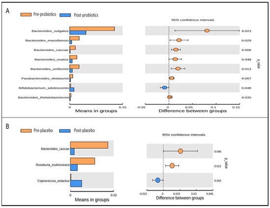 Significantly abundant gut microbial taxa at the species level within the probiotics (A) and placebo (B) groups pre- and post-intervention, identified using t-test analysis. p-value < 0.05 was considered statistically significant.