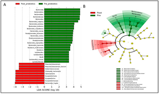 Linear discriminant analysis (LDA) effect size (LEfSe) analysis showing significantly abundant gut microbial taxa down to species level within the probiotics group. (A) Histogram represents the LDA scores for differentially abundant gut microbial taxa within the probiotics group, pre- and post-intervention. (B) Cladogram represents the taxonomic structure and relative abundance of the predominant gut microbial taxa within the probiotics group, pre- and post-intervention. The size of each dot in the cladogram represents the relative abundance of the identified gut microbial taxa. α < 0.05 and LDA score ≥ 2.0 were considered statistically significant.