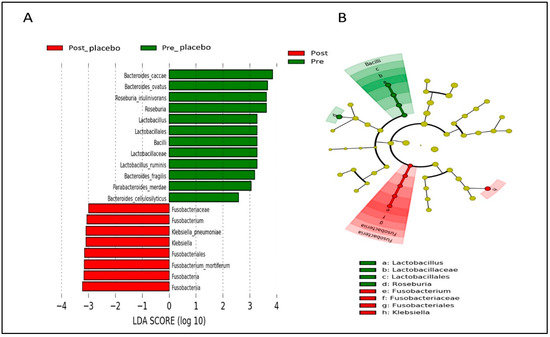 Linear discriminant analysis (LDA) effect size (LEfSe) analysis showing significantly abundant gut microbial taxa down to species level within the placebo group. (A) Histogram represents the LDA scores for differentially abundant gut microbial taxa within the placebo group, pre- and post-intervention. (B) Cladogram represents the taxonomic structure and relative abundance of the predominant gut microbial taxa within the placebo group, pre- and post-intervention. The size of each dot in the cladogram represents the relative abundance of the identified gut microbial taxa. α < 0.05 and LDA score ≥ 2.0 were considered statistically significant.
