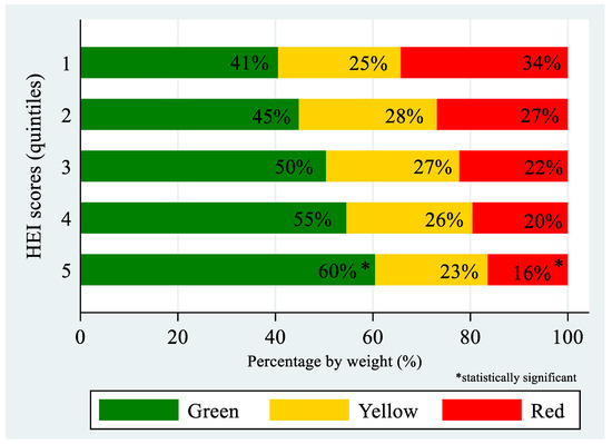 Percentage of green, yellow, and red foods by quintiles of HEI scores (n = 503).