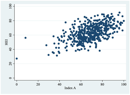 The correlation coefficients obtained using the 5-fold cross-validation are found in Table 2. The correlations between HEI and Indexes A, B, and C were very similar between all three methods (Ridge regression, cross-validation, and linear regression, respectively), but correlations for Index A generated by Ridge regression (Model 1) were slightly higher. The average correlation of HEI with Index A in a new sample was estimated to be 0.585 (SD = 0.06; p < 0.001), with Index B to be 0.585 (SD = 0.06, p < 0.001), and with Index C to be 0.584 (SD = 0.06, p < 0.001). Figure 2 shows the correlation between HEI and Index A in the sample analyzed.