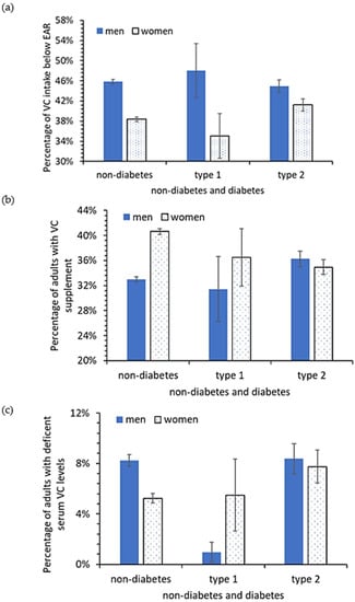 Figure 1 shows the percentage of men and women with VC intake below the EAR. The analyses indicated that 38.1% (95% CI 36.2–40.0%) of the US adult population with total VC intake below the EAR from 1999–2000 (75 mg/day for men and 60 mg/day for women). The percentage of VC intake below the EAR rose to 46.5% (95% CI 44.4–48.6%) in the final two years of the examined data, namely, 2017–2018 (corresponding to an increase of 22.1% (95% CI 21.6–22.5%) from 1999 to 2018). The rise was more significant in men than in women (Figure 2). The percentage of men below the VC EAR was relatively more consistent across the three conditions, no-diabetes, type I diabetes, and type 2 diabetes (45%, 47.9%, and 45.8%, respectively), than for women (41.2%, 33.4%, and 38.4%, respectively) (Figure 1). Overall, 63.2% (95% CI 62.6–63.8%) of the US adult population did not take any VC supplements between 1999 and 2018. Only about 33% and 35% of diabetic and non-diabetic men, and 35% and 40.6% of diabetic and non-diabetic women took VC supplements. The data in Table 4 also reveal the percent of men and women considered VC-deficient (VC level below 0.2 mg/dL). For men, a similar percent of non-diabetics and type 2 diabetics were VC-deficient (8.2% vs. 8.4%) while for women, 5.2% of non-diabetics were VC-deficient and 7.7% of type 2 diabetics were VC-deficient.