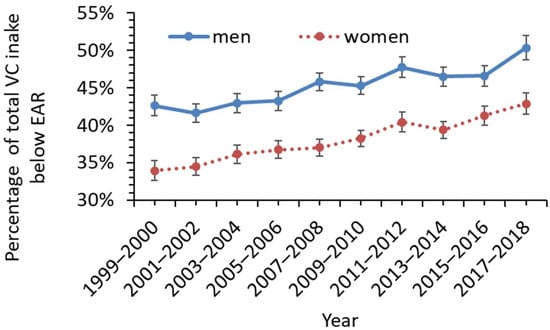 Rising trends of total VC intake below the estimated average requirements (EAR) for US adult men and women between 1999 and 2018. Vertical bars show standard errors.