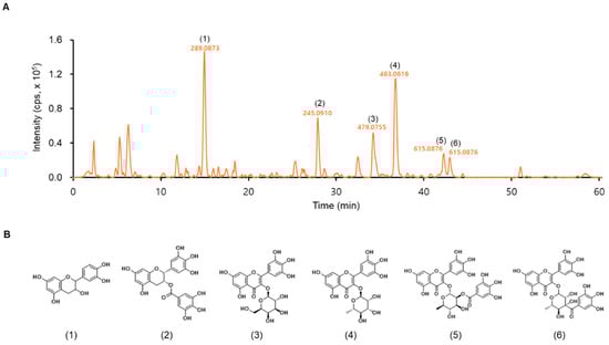 We analyzed LTE using LC-MS to identify its functional ingredients. The compounds were identified based on their mass spectra and by comparison with standards discussed in the previously published literature [] (Figure 1A). Compounds 1–6 were identified as (1): epicatechin (EC), (2): (−)-epigallocatechin-3-gallate (EGCG), (3): myricetin-3-O-β-D-galactopyranoside, (4): myricetin-3-O-α-L-rhamnopyranoside, (5): myricetin-3-O-(2″-O-galloyl)-α-L-rhamnopyranoside, and (6): myricetin-3-O-(3″-O-galloyl)-α-L-rhamnopyranosid (Figure 1B).