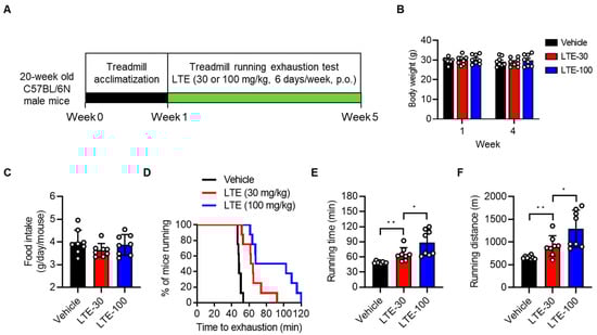Effects of LTE supplementation on treadmill running endurance. (A) Schematic of experimental design to assess the effect of LTE on exercise performance. (B,C) Body weight change after the 4-week exercise and LTE supplementation program, and daily food intake of mice (n = 8). (D) Running population plotted against time to exhaustion (10 min at 10 m/min with an increase in running speed by 2 m/min every 10 min to a maximum of 16 m/min). Total running time until exhaustion was determined (n = 8). (E,F) Average running time and running distance until exhaustion under a forced running exercise-to-exhaustion test using data acquired during the last two weeks of testing (n = 8). Values are mean ± S.E.M., * p < 0.05 and ** p < 0.01. LTE-30, LTE 30 mg/kg p.o.; LTE-100, LTE 100 mg/kg p.o.