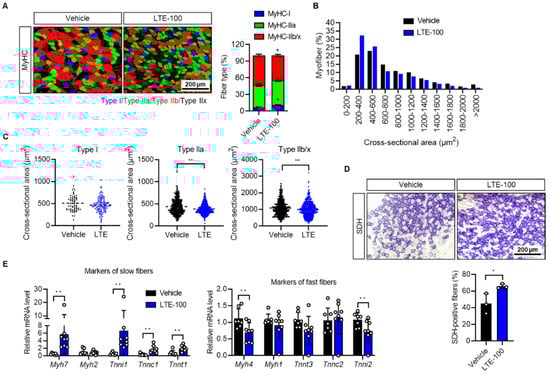 Effects of LTE supplementation on the proportion of muscle fiber-types. (A) Representative microscopic images of GAS muscles immunostained with anti-MyHC antibodies (types I, IIa, IIb, and IIx). The number of the different types of muscle fibers was counted manually (n = 5). Results are graphed as a percentage of the total number of fibers per muscle. (B) The quantification of the cross-sectional area of each type of myofibers in GAS muscles of mice is described in (A). (C) The cross-sectional area of each type of muscle fiber was determined based on the expression of MyHC-positive myofibers. (D) Succinate dehydrogenase (SDH) activity staining was performed on sections of GAS muscle (n = 3). (E) mRNA levels of known markers of type I and type II fibers were analyzed by qPCR. mRNA levels were standardized against Gapdh and plotted relative to the expression in vehicle-treated mice (n = 7–8). Values are mean ± S.E.M., * p < 0.05 and ** p < 0.01. LTE-100, LTE 100 mg/kg p.o.