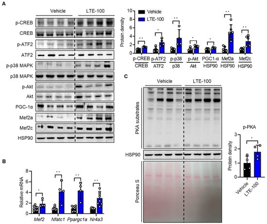 To delineate the molecular mechanisms which control fast-to-slow muscle fiber-type switching induced by LTE treatment, we analyzed the profiles of proteins involved in fiber-type specification. We first assessed the expression of key transcription factors and their regulators involved in mitochondrial biogenesis and maintenance of muscle integrity. Western blotting results indicated that the phosphorylation of CREB (49 ± 4%), ATF2 (160 ± 0%), p38 MAPK (258 ± 7%), Akt (49 ± 2%), and the protein and mRNA levels of PGC-1α (28 ± 1%), Mef2a (319 ± 9%), and Mef2c (131 ± 6%) were significantly increased in GAS muscles of LTE-treated mice compared to vehicle-treated mice (Figure 5A). We also found increased mRNA levels of genes downstream of CREB and of genes related to muscle fiber specification, such as Nfatc1 (318 ± 4%), Ppargc1a (332 ± 7%), and Nr4a3 (Nor1, 201 ± 8%) in the GAS muscles of LTE-treated mice (Figure 5B). Since PKA functions as an upstream kinase to activate CREB, we speculated that PKA may be activated by LTE. Western blotting for p-PKA substrates indicated that LTE increased PKA activity (Figure 5C), which was consistent with the increased level of p-CREB.