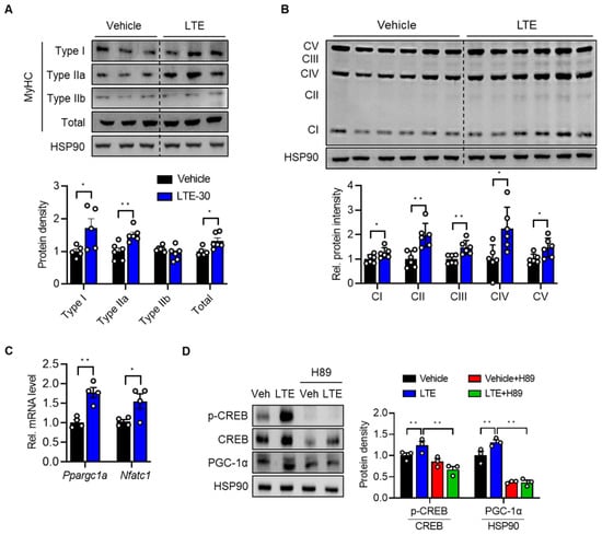 Effects of LTE treatment of C2C12 cells. C2C12 cells were incubated with LTE 30 μg/mL for 5 days in the differentiation medium. (A) Western blotting analysis of MyHC isoforms. Quantification results are shown (n = 4–6). (B) Western blotting for OxPhos proteins (n = 6). (C) qPCR analysis of the expression of Ppargc1a (encoding PGC-1α) and Nfatc1 (n = 4). (D) Western blotting analysis after co-treatment of H89 (10 μM) and LTE. LTE, LTE 30 μg/mL; MyHC, myosin heavy chain; PGC-1α, peroxisome proliferator-activated receptor γ coactivator 1α; Nfatc1, nuclear factor of activated T cell 1. Values are mean ± S.E.M. * p < 0.05 and ** p < 0.01.