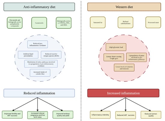 Proposed mechanisms for the impact of anti-inflammatory and Western diets on inflammation and fertility outcomes.