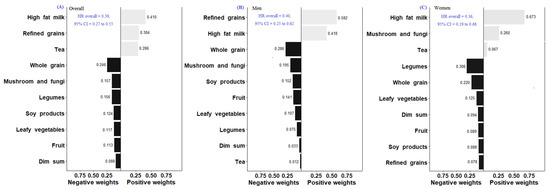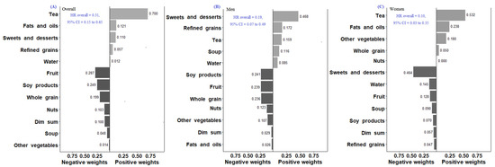 Weights representing the proportion of the positive or negative partial effects of each food group on all-mortality risk in the Quantile G-Computation Overall (A), Men (B), and Women (C). Model adjusted for sex, age, dietary energy, body mass index, physical activity, systolic blood pressure, medical history (diabetes, hypertension, stroke, heart attack, angina, congestive heart failure or cancer), smoking habits, alcohol drinking, and education level.