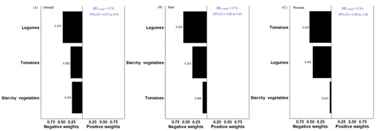 Weights representing the proportion of the positive or negative partial effects of each food group on cancer-mortality risk in the Quantile G-Computation Overall (A), Men (B), and Women (C). Model adjusted for sex, age, dietary energy, body mass index, physical activity, systolic blood pressure, medical history (diabetes, hypertension, stroke, heart attack, angina, congestive heart failure or cancer), smoking habits, alcohol drinking, and education level.