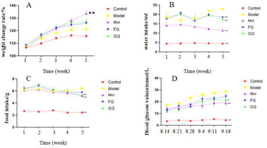 (A) Effect of Pueraria polysaccharide on body weight of db/db mice (n = 10; ** p < 0.01 compared with the model group). (B) Effect of Pueraria polysaccharide on the water intake of db/db mice (n = 10; ** p < 0.01 compared with the model group). (C) Effect of Pueraria polysaccharide on food intake of db/db mice (n = 10; ** p < 0.01 compared with the model group). (D) Effect of Pueraria polysaccharide on fasting blood glucose in db/db mice (n = 10; * p < 0.05; ** p < 0.01 compared with the model group).