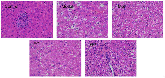 Serum biochemical indices (Table 1) showed that insulin, ADP, and GLP-1 were up-regulated, while LEP, FFA, IL-6, and TNF-α decreased. In addition, a decreasing trend in the insulin resistance index, liver index, and adipose index after Pueraria polysaccharide administration was observed. No significant difference in the above biochemical indexes between the GG polysaccharide and FG polysaccharide groups was observed. Moreover, the alveolar fat droplets decreased, and nuclear pyknosis and apoptosis improved to varying degrees after the intervention of metformin, GG polysaccharide, and FG polysaccharide, as shown in Figure 4.
