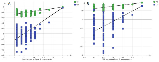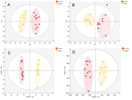MS data were processed for peak detection, matching and alignment using Progenesis QI software (version 2.4, Waters, Milford, MA, USA). The normalized data were imported into the EZinfo software (version 3.0, Waters, USA) to select metabolites with a VIP score greater than 1 and a P value by ANOVA less than 0.05 as differential metabolites. The data file was saved and the differential metabolites were identified using the database Human Metabolome Database (http://www.hmdb.ca/) (accessed on 11 June 2021). to identify whether they were endogenous components; the mass error was 5 ppm, and the secondary fragments were recorded. PCA, PLS, and OPLS-DA were performed using SIMCA-P software (version 14.1, Umetrics, Sweden). The accuracy of OPLS-DA analysis was verified by PRT analysis. GraphPad Prism (version 8.0, Harvey Motulsky, San Diego, CA, USA) was used to draw the graphs; MeV software (version 4.9.0, TIGR, Walnut Creek, CA, USA) was used for heat mapping. MetaboAnalyst 5.0 (https://www.metaboanalyst.ca/) (accessed on 23 July 2021) online software was used to evaluate the enrichment of the metabolic pathways.