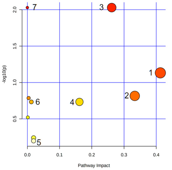 Overview of the metabolic pathway analysis. 1. Arachidonic acid metabolism; 2. Alpha-linolenic acid metabolism; 3. Glycerophospholipid metabolism; 4. Retinol metabolism; 5. Steroid hormone biosynthesis; 6. Glycerolipid metabolism; 7. Biosynthesis of unsaturated fatty acids.
