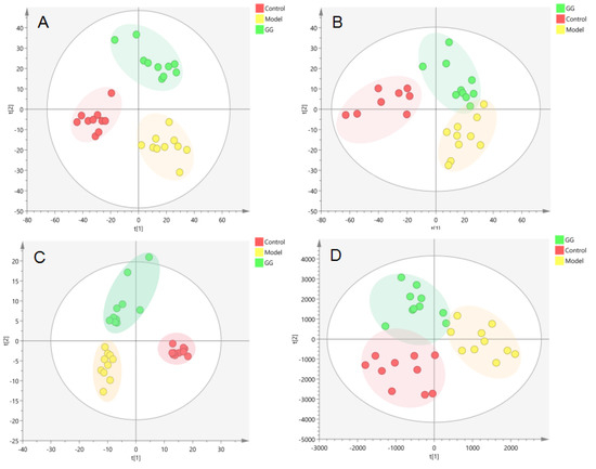 Metabolic profile in the serum of the T2D db/db mice treated with GG polysaccharide ((A). NEG, PCA; (B). POS, PCA; (C). NEG, PLS-DA; (D). POS, PLS-DA).