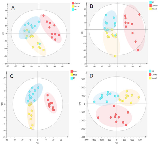 Metabolic profile in the serum samples of T2D db/db mice treated with FG polysaccharide ((A). NEG, PCA; (B). POS, PCA; (C). NEG, PLS-DA; (D). POS, PLS-DA).