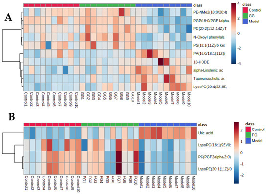 (A) Heat map analysis of differential metabolites in the serum after GG polysaccharide treatment. (B) Heat map analysis of differential metabolites in the serum after FG polysaccharide treatment.