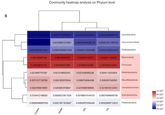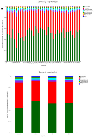 The analysis of the phylum (Figure 13A) revealed a higher relative abundance of Bacteroidetes, as well as lower levels of Firmicutes, desulphurobacteria, Campylobacter, Deferrobacteriaceae, and actinobacteria in the model group than in the normal group. Pueraria polysaccharide treatment reversed the relative abundance of these bacteria modified by T2D, almost reaching the same situation in the normal mice, as shown in Figure 13B. No significant difference between the effects of the GG polysaccharides and FG polysaccharides was observed.