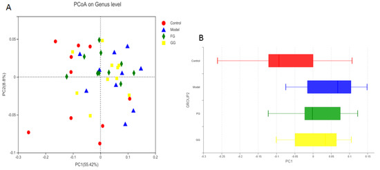 The analysis of the genus shown in Figure 14A with the PCoA analysis of all samples based on the weighted-unifrac distance algorithm revealed a clear separation and evident spatial clustering of the plots. The boxplots in Figure 14B represent the distribution of different groups of samples on the PC1 axis, revealing that the difference between the normal group and model group was the largest, and the distance between the GG polysaccharide group and model group was larger than the distance between the FG polysaccharide group and model group. The ANOSIM analysis demonstrated significant differences among the samples, but no significant difference was observed between the GG and FG polysaccharide groups. LEfSe analysis was used with an LDA threshold of two to analyze the differences in the genus levels between the normal group and the model group, and the multi-group comparison strategy was one-against-all. A significant difference in bacterial abundance at the level of 45 genera in the model group was observed, as shown in Figure 15A. The bacterial abundance of 18 genera was significantly affected (p < 0.05) after 5 weeks of FG polysaccharide intervention, and the bacterial abundance of 14 genera was significantly affected (p < 0.05) after 5 weeks of GG polysaccharide intervention, as shown in Figure 15B,C. A total of 20 bacteria had a callback trend at the genus level after the intervention of FG polysaccharide (Figure 16A), and among them, g_Helicobacter, g_norank_f_Ruminococcaceae, and g_Colidextribacter were significantly up-regulated, while the g_Eubacterium_siraeum_group and g_Klebsiella significantly decreased. A total of 23 bacteria had a callback trend at the genus level (Figure 16B), and among them, g_Helicobacter, g_Romboutsia, and g_UBA1819 were significantly up-regulated, while g_Parasutterella, g_Faecalibaculum, and g_Weissella significantly decreased. GG polysaccharides and FG polysaccharides significantly regulated the content of different bacteria except for g_Helicobacter.