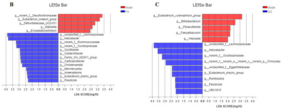 LEfSe linear discriminant analysis of the cecal microflora in db/db mice ((A). normal group vs. model group; (B). model group vs. FG group; (C). model group vs. GG group).