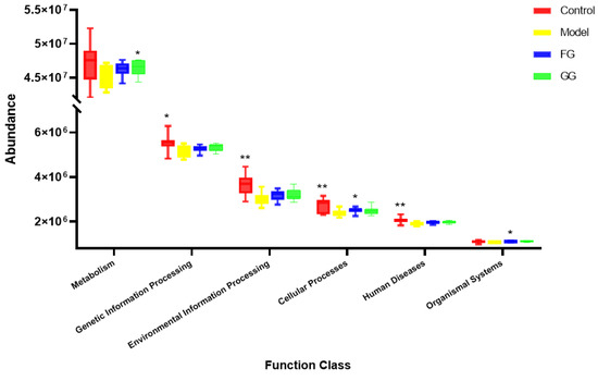KEGG pathway level 1 box diagram (n = 10; * p < 0.05; ** p < 0.01 compared with the model group).