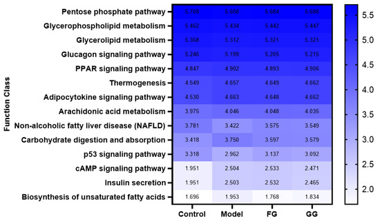 Three levels of information and abundance tables of metabolic pathways were obtained via PICRUSt function prediction. In pathway level 1, the expression of metabolism, organic systems, genetic information processing, environmental information processing, cellular processes, and human disease pathways in the model group was lower than that of the normal group. A callback trend was observed after the intervention with Pueraria polysaccharide (Figure 17). A total of 46 metabolic pathway subfunctions were enriched at pathway level 2; these metabolism-related pathways consisted of carbohydrate metabolism, amino acid metabolism, energy metabolism, lipid metabolism, and other metabolic pathways. The prediction analysis of pathway level 3 showed the involvement of 338 metabolic pathways in total, and among them, 153 metabolic pathways were significantly different between the normal group and the model group (p < 0.05). The analysis of these 153 metabolic pathways with significant differences revealed that they were related to diabetes, as shown in Figure 18. After Pueraria polysaccharide intervention reversed the abundance of these metabolic pathways. There was no significant difference between the effect of GG polysaccharide and FG polysaccharide.
