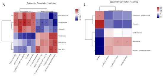 Correlation analysis between the cecal microflora and metabolites affected by Pueraria polysaccharide intervention ((A): GG; (B): FG; red represents a positive correlation, blue represents a negative correlation, * p < 0.05, ** p < 0.01, *** p < 0.001).