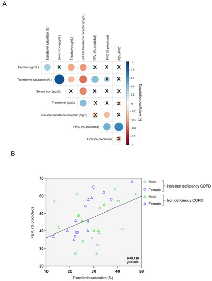 Correlation matrix of blood iron metabolism parameters and lung function parameters in all COPD patients (A) and scatter plot representation of correlation between FEV1 and transferrin saturation in all COPD patients (B). In matrix, blue color represents positive correlations, while negative correlations are indicated in red. Crosses inside the circle mean that the correlation is not statistically significant (p value > 0.05). The correlation coefficients (Y axis of the graph) are proportional to the circle color intensity and size. In the scatter plot, the green color indicates male patients, while the blue color indicates female patients. The dots represent the patients with non-iron deficiency while the triangles represent the patients with iron deficiency. Abbreviations: FEV1, first second of forced expiration; FVC, forced vital capacity; COPD, chronic obstructive pulmonary disease.