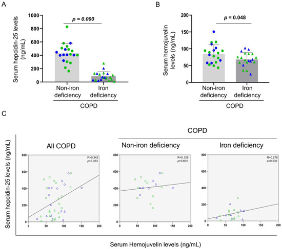 Serum levels of hepdicin-25 and hemojuvelin were significantly reduced in iron deficiency patients when compared to non-iron deficiency patients (Figure 2A,B, respectively). Furthermore, significant positive correlations were observed in these two serum parameters among all COPD patients, but not when analyzed independently (Figure 2C, respectively).
