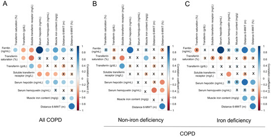 Correlation matrix of the iron metabolism parameters and six-minute walk test distance in (A) all COPD patients, (B) non-iron deficiency and (C) iron deficiency COPD patients. In matrix, blue color represents positive correlations, while negative correlations are indicated in red. Crosses inside the circle mean that the correlation is not statistically significant (p value > 0.05). The correlation coefficients (Y axis of the graph) are proportional to the circle color intensity and size. Abbreviations: 6-MWT, six-minute walk test. Definition of abbreviations: COPD, chronic obstructive pulmonary disease.