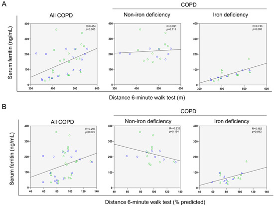 Scatter plots representation of correlations between serum ferritin levels and six-minute walk test distance (m) (A) and six-minute walk test distance (% predicted) (B) in all COPD patients (left panels), non-iron deficiency (middle panels) and iron deficiency (right panels) COPD patients. In the scatter plots, the green color dots or triangles indicate male patients in either study group, while the blue color dots or triangles indicate female patients in the same groups. Definition of abbreviations: COPD, chronic obstructive pulmonary disease.