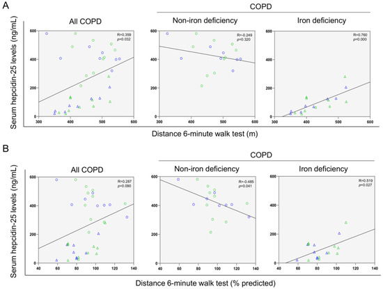 Scatter plots representation of correlations between serum hepcidin levels and distance six-minute walk test (m) (A) and distance six-minute walk test (% predicted) (B) in all COPD patients (left panels), non-iron deficiency (middle panels) and iron deficiency (right panels) COPD patients. In the scatter plots, the green color dots or triangles indicate male patients in either study group, while the blue color dots or triangles indicate female patients in the same groups. Definition of abbreviations: COPD, chronic obstructive pulmonary disease.