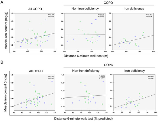 Scatter plots representation of correlations between muscle iron content and distance six-minute walk test (m) (A) and distance six-minute walk test (% predicted) (B) in all COPD patients (left panels), non-iron deficiency (middle panels) and iron deficiency (right panels) COPD patients. In the scatter plots, the green color dots or triangles indicate male patients in either study group, while the blue color dots or triangles indicate female patients in the same groups. Definition of abbreviations: COPD, chronic obstructive pulmonary disease.