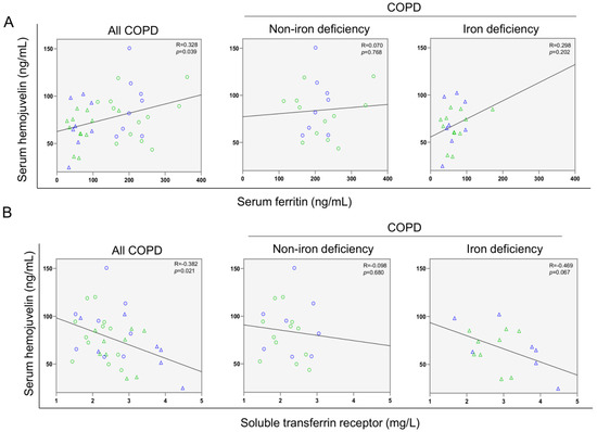 Scatter plots representation of correlations between serum hemojuvelin levels and serum ferritin (A) and soluble transferrin receptor (B) in all COPD patients (left panels), non-iron deficiency (middle panels) and iron deficiency (right panels) COPD patients. In the scatter plots, the green color dots or triangles indicate male patients in either study group, while the blue color dots or triangles indicate female patients in the same groups. Definition of abbreviations: COPD, chronic obstructive pulmonary disease.
