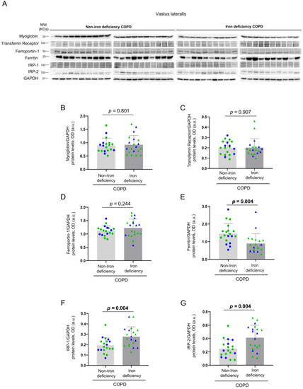 Representative immunoblots of myoglobin, transferrin receptor, ferroportin-1, ferritin, IRP-1, IRP-2 and GAPDH proteins in the vastus lateralis of all COPD patients (A). Mean values and standard deviation of myoglobin (B), transferrin receptor (C), ferroportin-1 (D), ferritin (E), IRP-1 (F) and IRP-2 (G) protein content as measured by optical densities in arbitrary units (OD, a.u.). In the graphs, the green color dots or triangles indicate male patients in either study group, while the blue color dots or triangles indicate female patients in the same groups. Definition of abbreviations: IRP, Iron regulatory protein; GAPDH, glyceraldehyde-3-phosphate dehydrogenase; MW, molecular weight; kDa, kilodalton. Adjusted p values for gender differences are shown in the graphs.