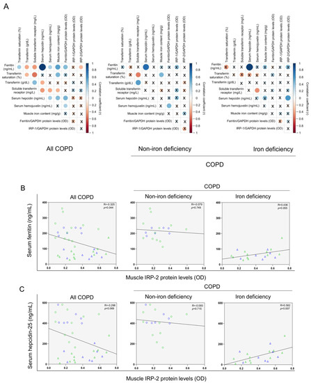 Correlation matrix of the blood and muscle iron metabolism parameters in all COPD patients (left panels), non-iron deficiency (middle panel) and iron deficiency (right panel) COPD patients (A). In matrix, blue color represents positive correlations, while negative correlations are indicated in red. Crosses inside the circle mean that the correlation is not statistically significant (p value > 0.05). The correlation coefficients (Y axis of the graph) are proportional to the circle color intensity and size. Scatter plots representation of correlations between serum ferritin and muscle IRP-2 protein levels (B), and serum hepcidin and muscle IRP-2 protein levels (C), in all COPD patients (left panels), non-iron deficiency (middle panel) and iron deficiency (right panel) COPD patients. In the scatter plots, the green color dots or triangles indicate male patients in either study group, while the blue color dots or triangles indicate female patients in the same groups. Definition of abbreviations: IRP, Iron regulatory protein; GAPDH, glyceraldehyde-3-phosphate dehydrogenase; MW, molecular weight.
