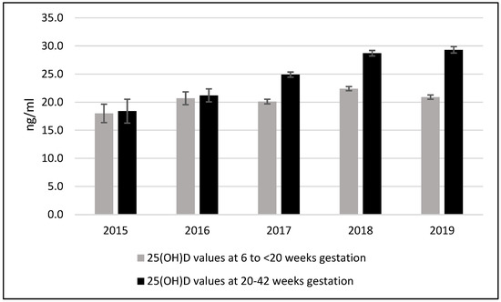 During the 2017–2019 supplementation period, among the 1095 prenatal women with 25(OH)D concentrations in both early (6–19 weeks gestation) and late (20+ weeks gestation) pregnancy, there was a significant increase in mean 25(OH)D concentration from 21.1 ng/mL (SD 7.5) at 6–19 weeks gestation to 27.9 ng/mL (SD 10.3) (p < 0.0001) at 20+ weeks gestation. In contrast, during the pre-supplementation period (2015–2016), there was no significant change in 25(OH)D between early and late pregnancy (20.4 ng/mL vs. 20.9 ng/mL, p = 0.73, n = 50). There was also no significant difference between mean early pregnancy 25(OH)D concentrations for the pre-supplementation and post-supplementation groups (20.4 ng/mL [SD 7.2] vs. 21.1 ng/mL [SD 7.5], p =0.52).