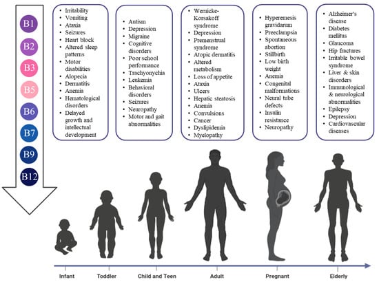 Though a sufficient quantity of the B vitamins should be attained from a healthy diet, growing evidence suggests that humans at specific locations have increasing demands of one or more of the B vitamins, such as childhood or pregnancy, which might pose a negative impact on overall health and or brain functions as explained in detail in the following subsections. The deficiency of these vitamins in different life stages is crucial and might predispose humans to a multitude of disorders, as illustrated in Figure 2.
