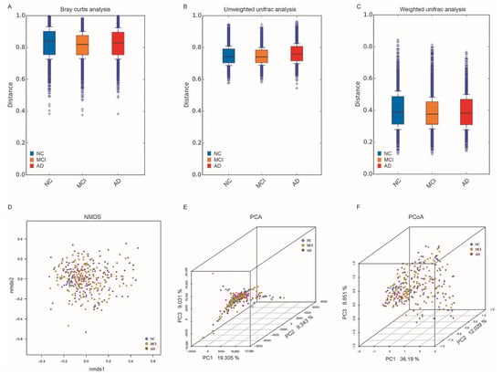 Beta diversity analysis in NC, MCI, and AD. (A–C) The beta diversity of NC, MCI, and AD by bray–Curtis (A), unweighted unifrac (B), and weighted unifrac (C) analyses. (D) Non-metric multidimensional scaling (NMDS) analysis of the gut microbial in NC, MCI, and AD. (E) Principal component analysis (PCA) among the three groups. (F) Principal co-ordinates analysis (PCoA) among the three groups. NC, cognitively normal controls; MCI, mild cognitive impairment; AD, Alzheimer’s disease; Nmds, non-metric multidimensional scaling; PCA, principal component analysis; PCoA, principal co-ordinates analysis.